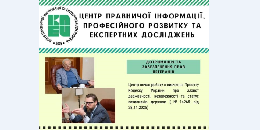 Розпочато експертне опрацювання проєкту Кодексу України про захист державності, незалежності та статус захисників держави (№14265), зокрема в частині забезпечення прав ветеранів.